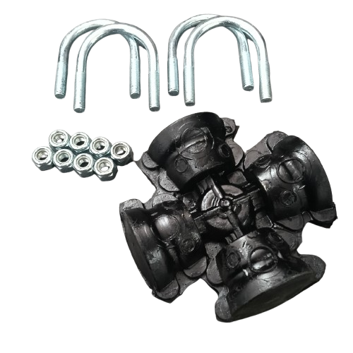 The very early Minis used the rubber U-joint drive couplings to eliminate harshness being transmitted to the passenger compartment. Over the years the rubber will separate from the metal sleeves and allow the driveshaft to rotate out of concentricity. Not only can this cause vibration, but it can also allow it to hit either the tranny case or, more often, the exhaust pipe. These are standard replacements with u bolts and nuts for one side only.